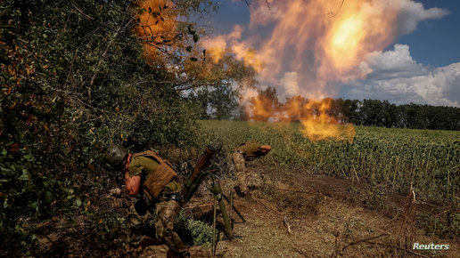 أطلق جنود أوكرانيون قذيفة هاون على خط المواجهة مع القوات الروسية في منطقة دونيتسك بأوكرانيا في 18 أغسطس 2022