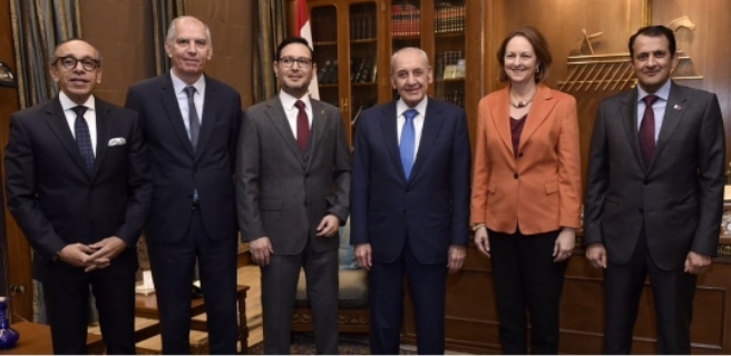 استقبل رئيس مجلس النواب نبيه بري في مقر الرئاسة الثانية في عين التينة، سفراء اللجنة الخماسية: سفير المملكة العربية السعودية وليد بخاري، سفير دولة قطر الشيخ سعود بن عبدالرحمن بن فيصل آل ثاني ، السفير الفرنسي هيرفي ماغرو، سفير جمهورية مصر العربية علاء موسى ، سفيرة الولايات المتحدة الاميركية ليزا جونسون، في حضور مستشاري الرئيس بري الدكتور محمود بري وعلي حمدان.
