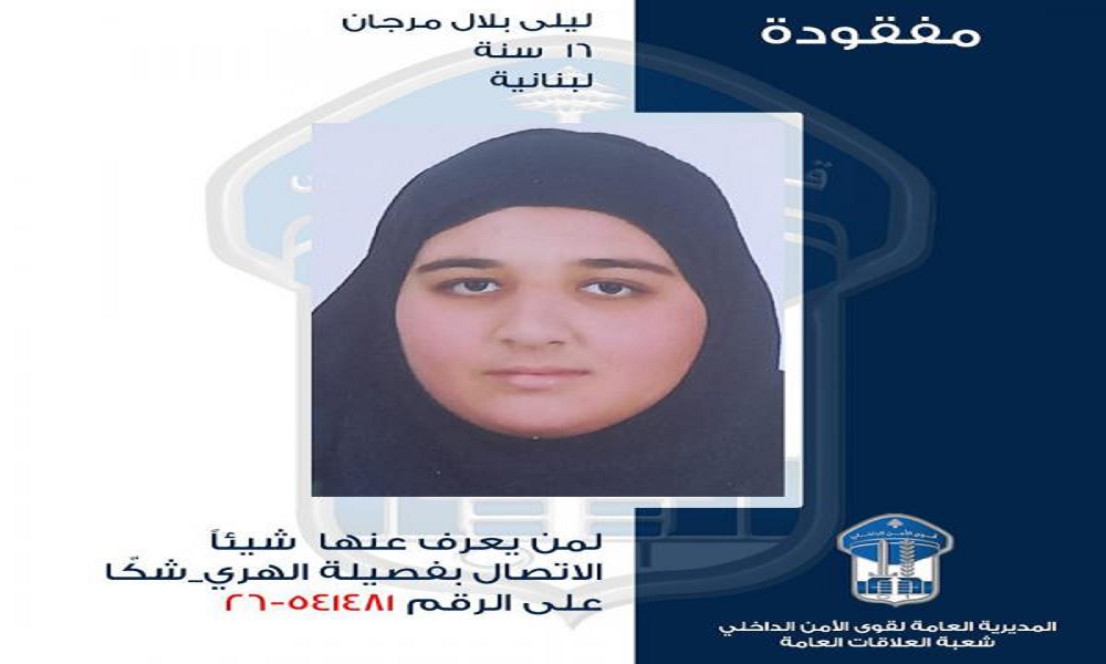 ليلى غادرت منزل ذويها الكائن في محلّة شكّا بتاريخ 12/9/2022، ولم تَعُد لغاية تاريخه.