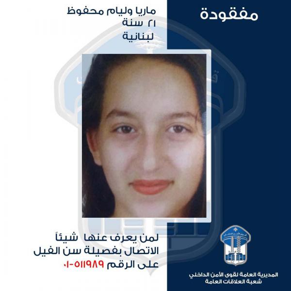 تُعمِّم المديريّة العامّة لقوى الأمن الدّاخلي، بناءً على إشارة القضاء المختص، صورة المفقودة: