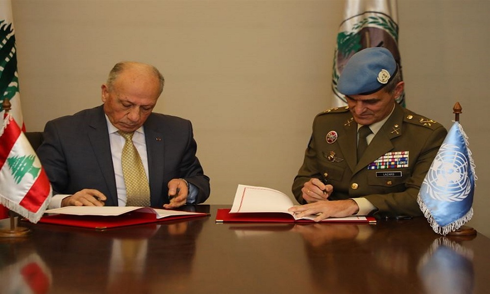 جاء ذلك خلال استقباله في مكتبه في اليرزة، رئيس بعثة اليونيفيل وقائدها العام اللواء أرولدو لازارو على رأس وفد، حيث جرى التوقيع على اتفاقية تمديد أحكام مذكرة التفاهم الخاصة بتقديم الدعم اللوجستي ( الوقود والغذاء والدواء) للجيش اللبناني لدى تنفيذ الأنشطة المشتركة بين الجيش واليونيفيل وذلك لمدة ستة أشهر لا تتخطى 28 شباط 2023 تنفيذًا لما نصت عليه الفقرة 11 من القرار 2650 الصادر في 31 آب 2022 والذي بموجبه طلب مجلس الأمن من اليونيفيل تمديد التدابير المؤقتة والخاصة بالدعم بشكل استثنائي.