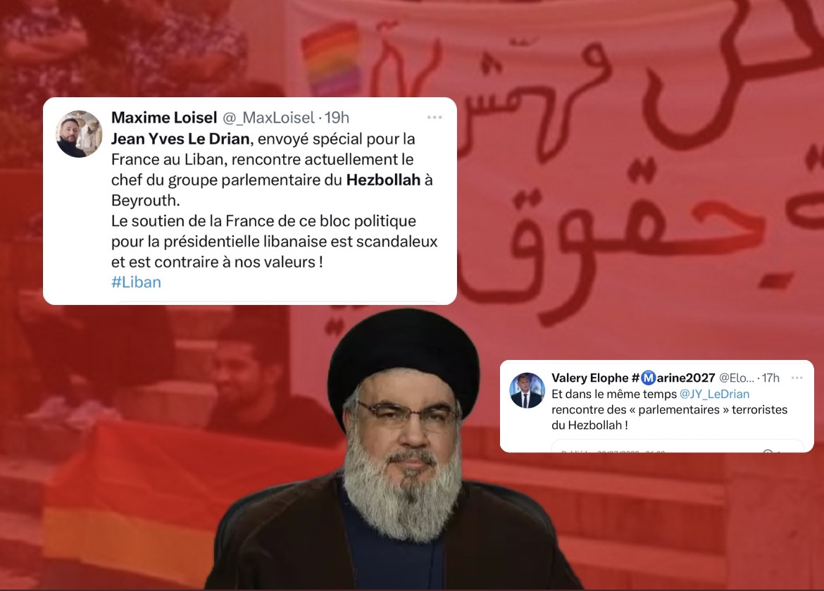 فليري شاب فرنسي داعم للمارين لوبن كما يظهر الى جانب اسمه على تطبيق "اكس" كتب معلقًا : و في نفس الوقت يلتقي الموفد الفرنسينواب "ارهابيين" من حزب الله.