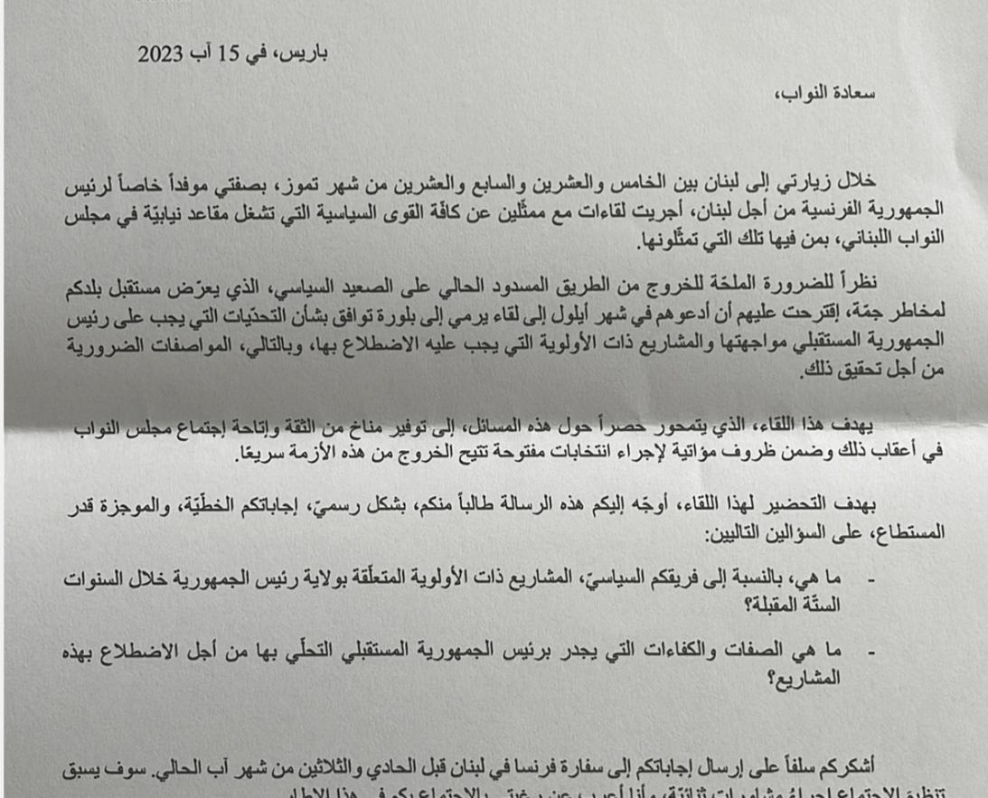 وطلب لودريان من نواب التغيير الاجابة الخطية والموجزة على السؤالين.